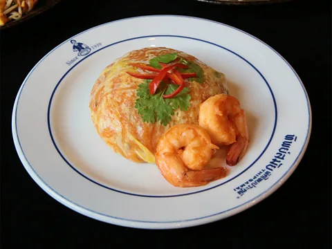 Thipsamai의 오리지널 버전의 pad Thai는 태국 Chanthaburi 지방의 부드럽고 촉촉한 sen chan 국수와 가족 레시피에 따라 만든 새우 기름으로 조리됩니다 . 이것이 인기의 비결입니다. 국수 부분은 얇은 계란 양피지로 싸여 있습니다.